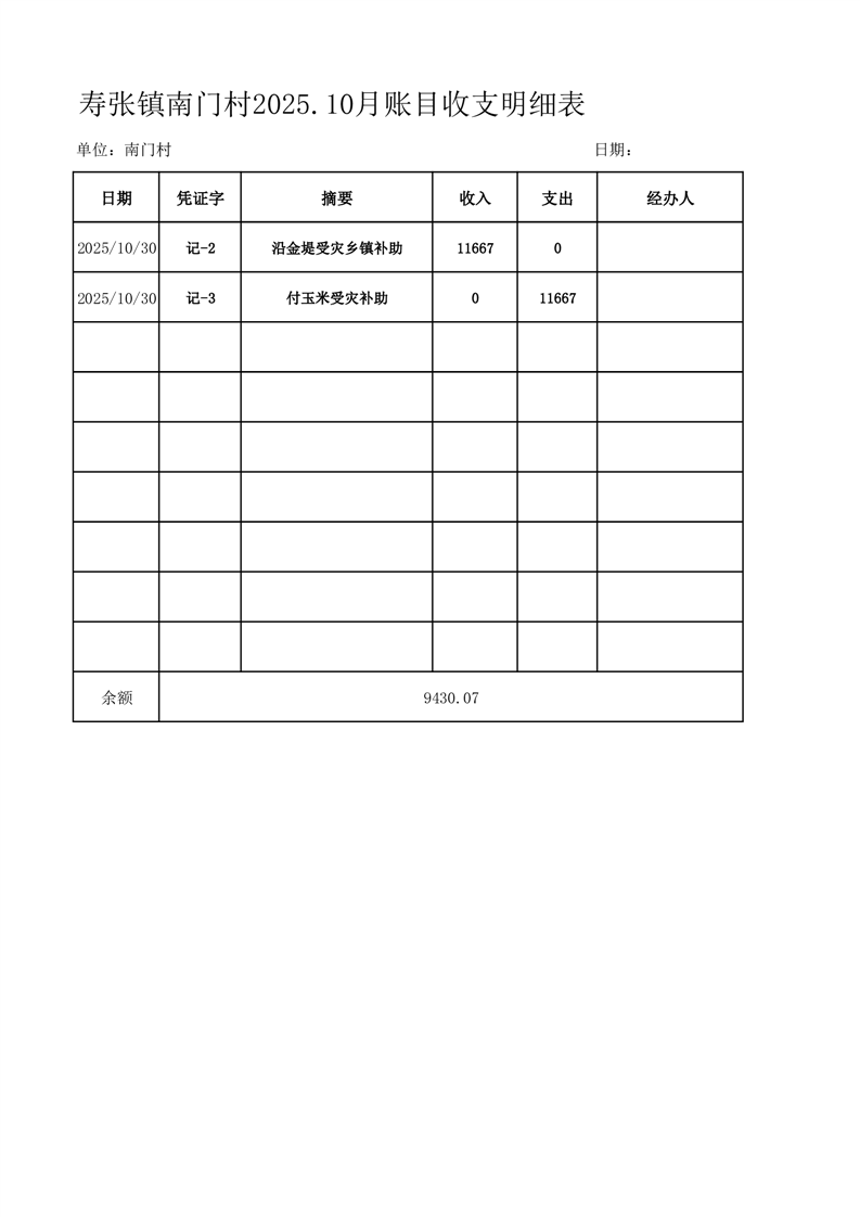 寿张镇南门村2025.10月账目收支明细表