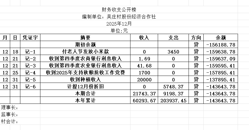 阿城镇吴庄村2025年12月份账目收支明细表