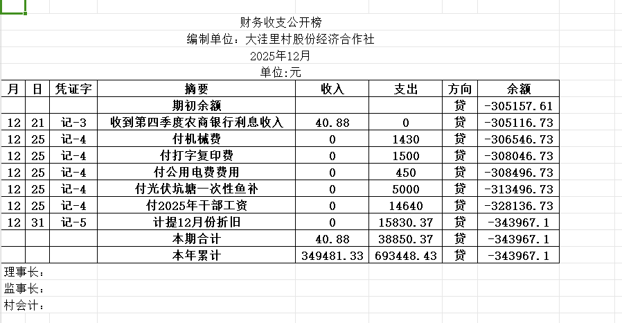 阿城镇大洼里村2025年12月份账目收支明细表