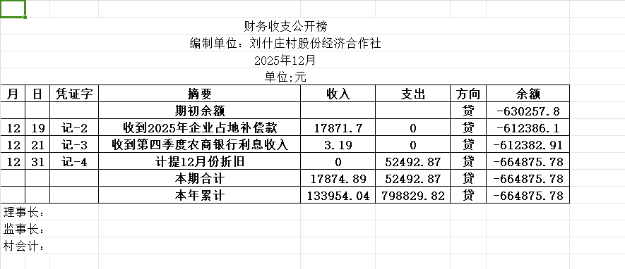 阿城镇刘什庄村2025年12月份账目收支明细表