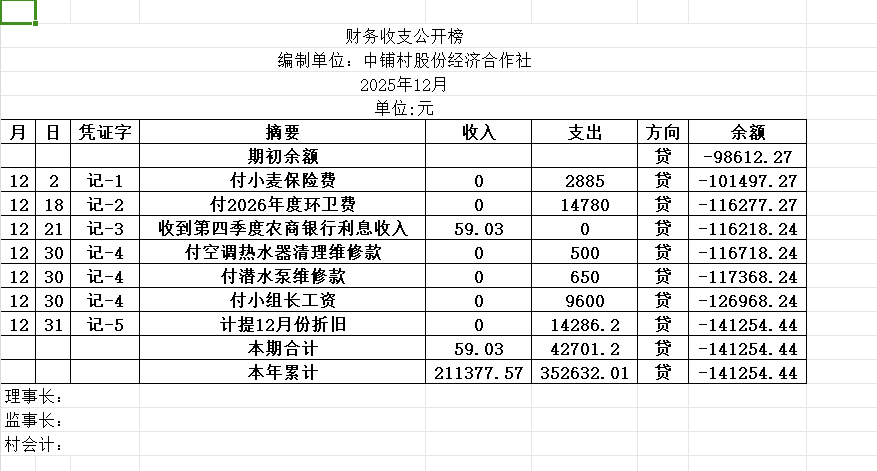阿城镇中铺村2025年12月份账目收支明细表