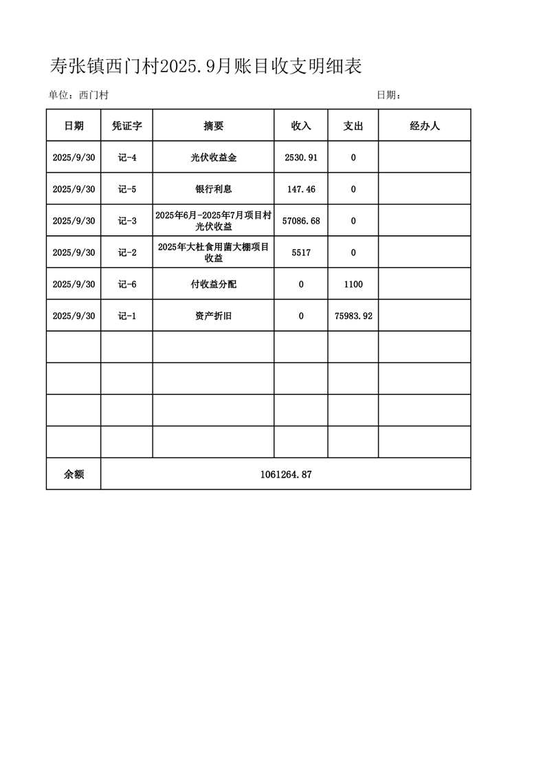 寿张镇西门村2025.9月账目收支明细表