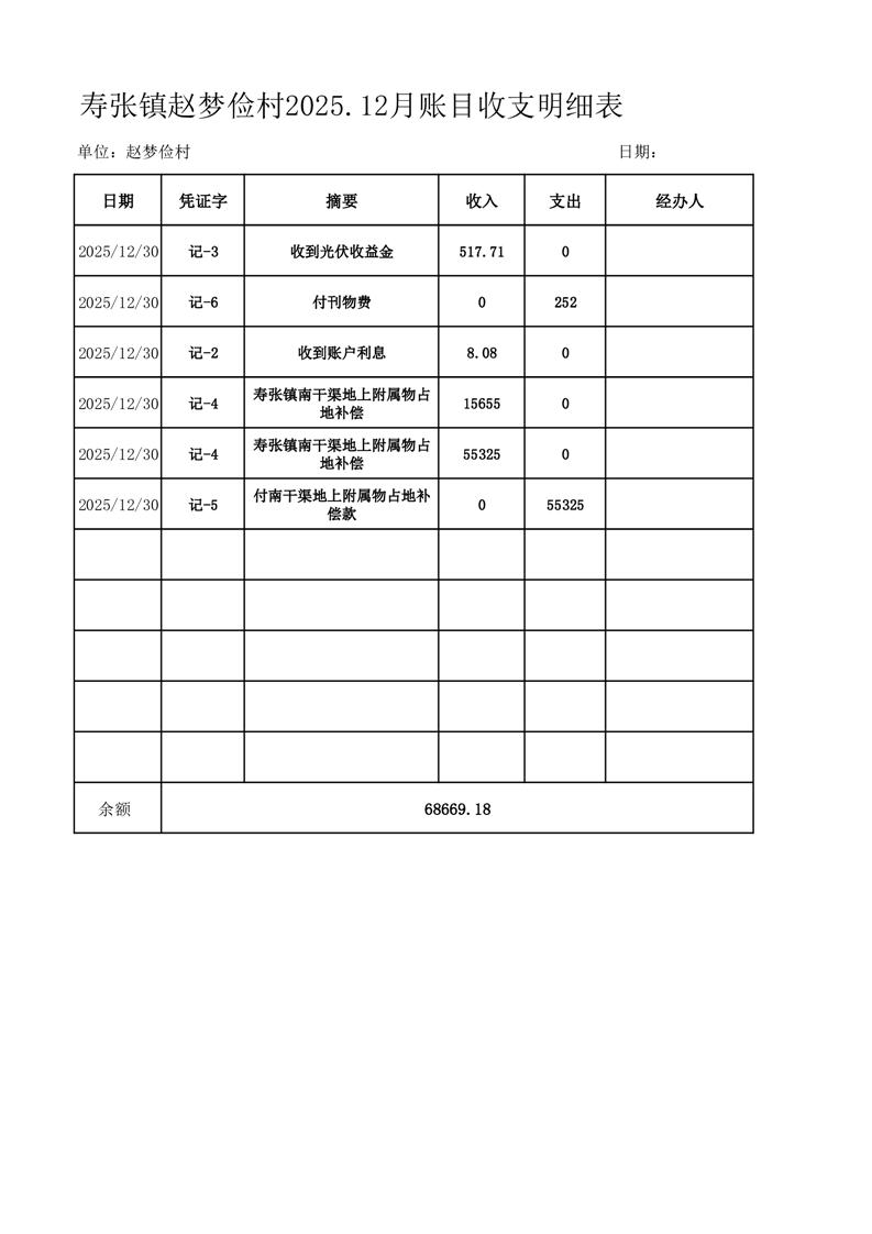 寿张镇赵梦俭村2025.12月账目收支明细表