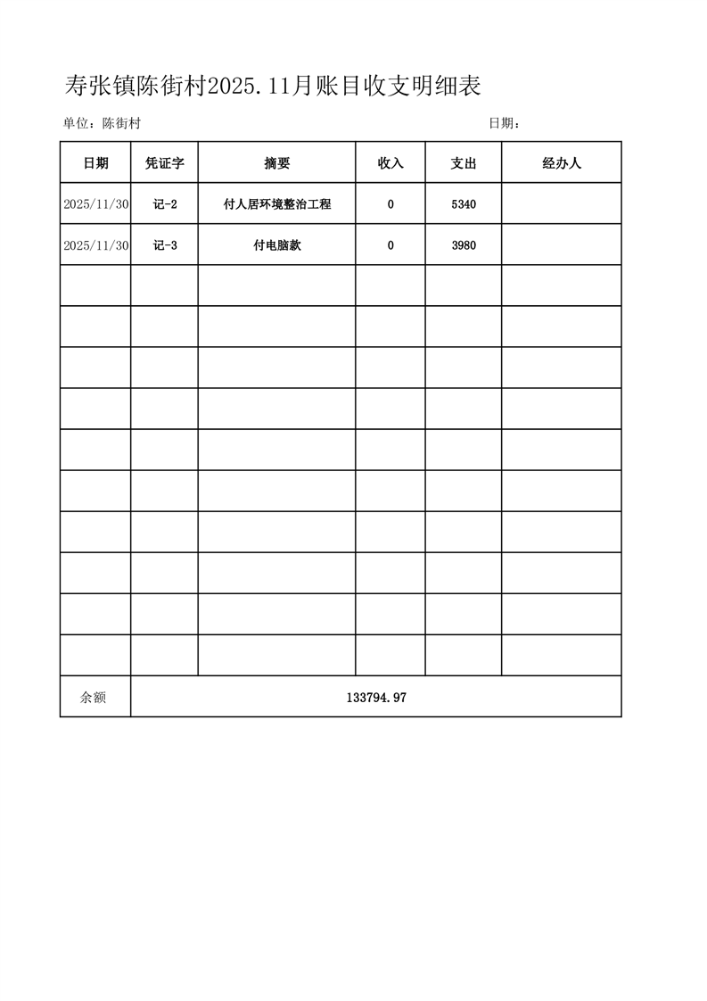 寿张镇陈街村2025.11月账目收支明细表