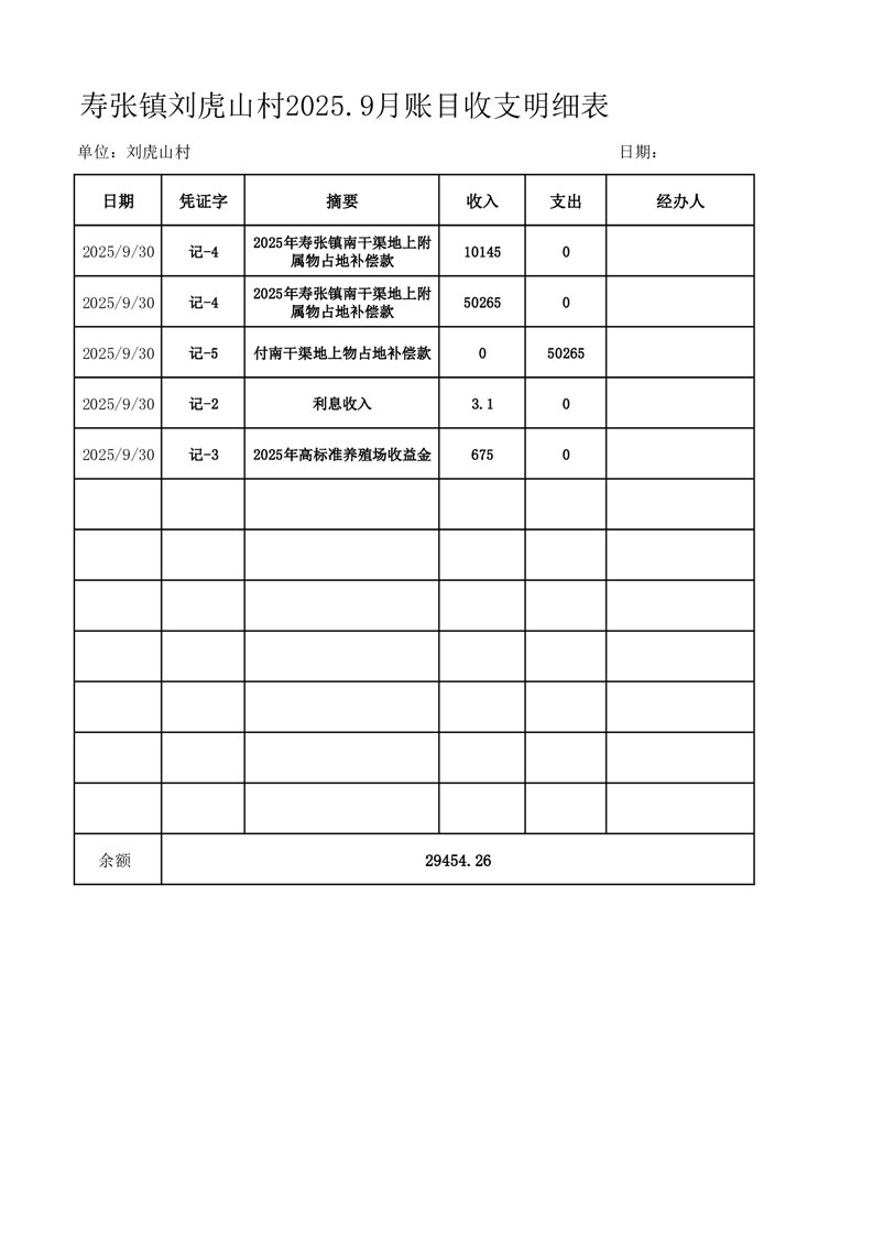 寿张镇刘虎山村2025.9月账目收支明细表