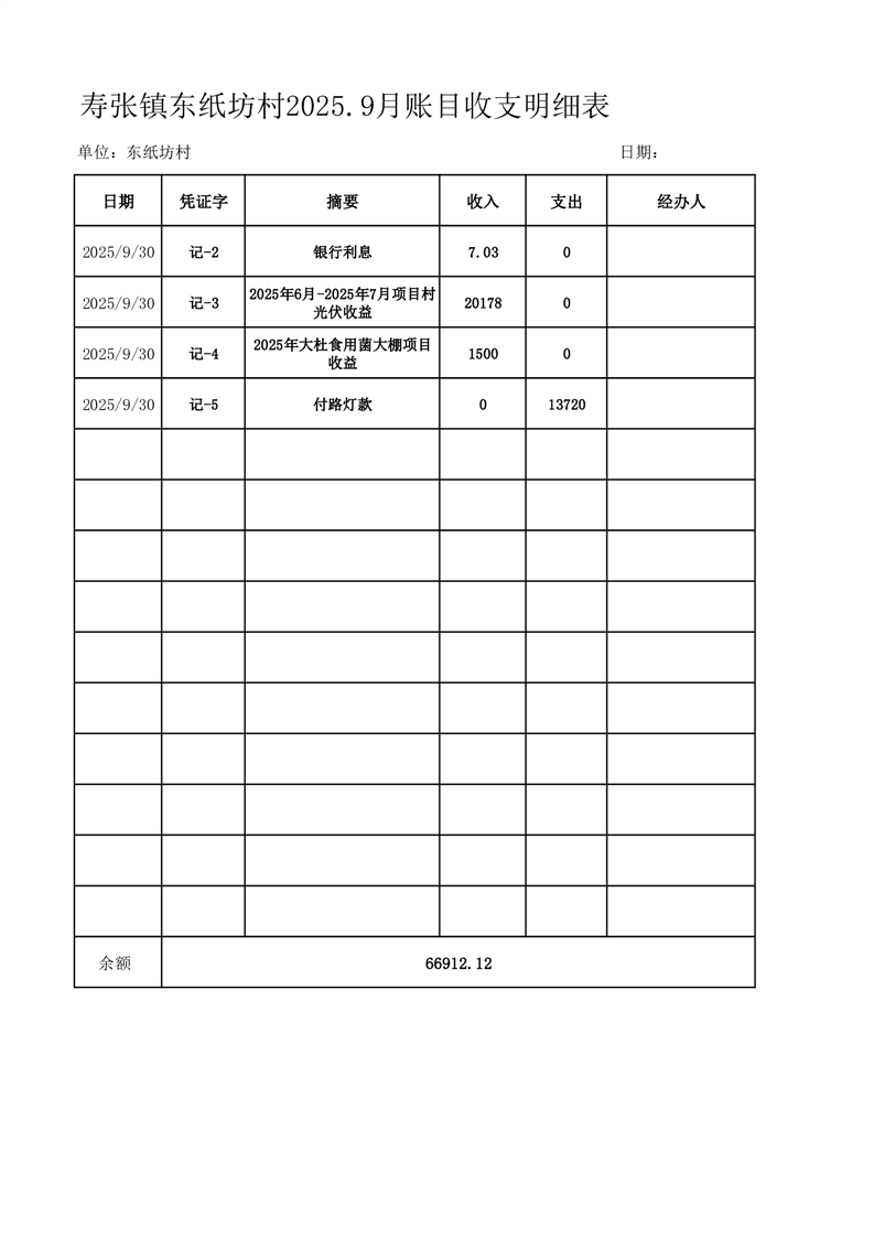 寿张镇东纸坊村2025.9月账目收支明细表