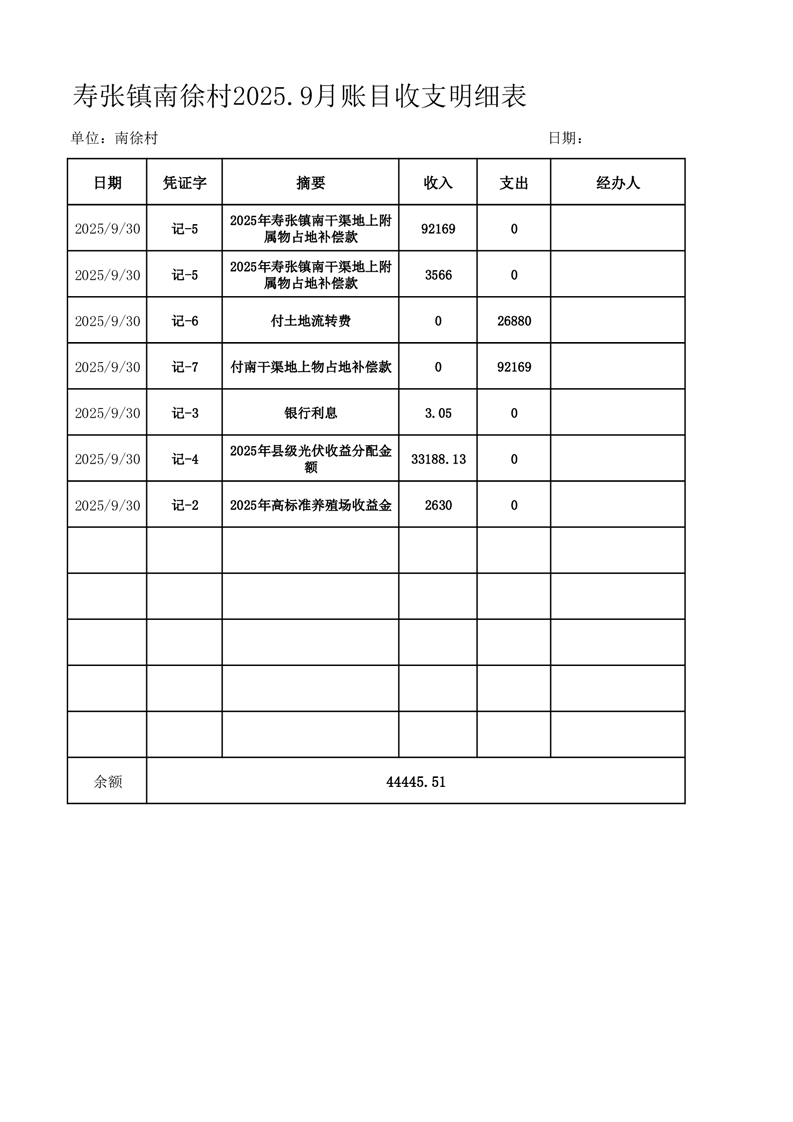 寿张镇南徐村2025.9月账目收支明细表