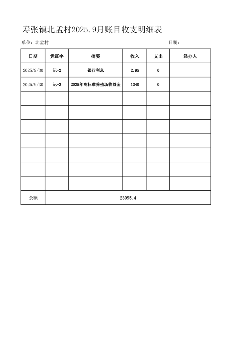 寿张镇北孟村2025.9月账目收支明细表