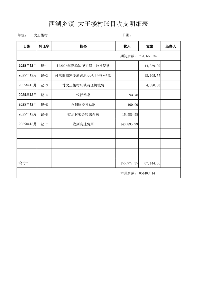 2025年12月份西湖镇大王楼村账目收支情况表