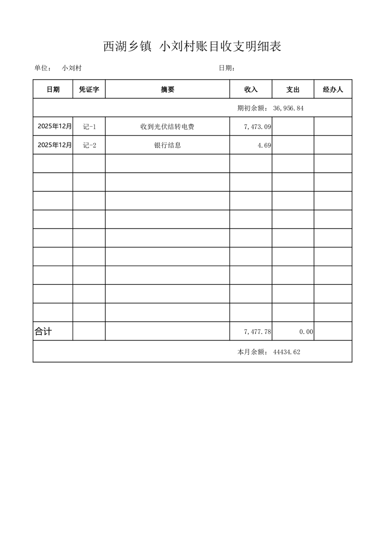 2025年12月份西湖镇小刘村账目收支情况表