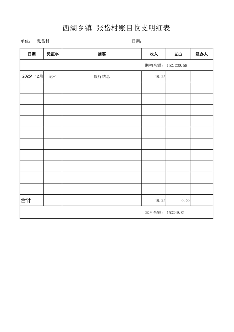 2025年12月份西湖镇张岱村账目收支情况表