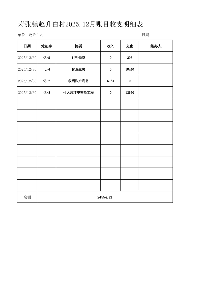 寿张镇赵升白村2025.12月账目收支明细表