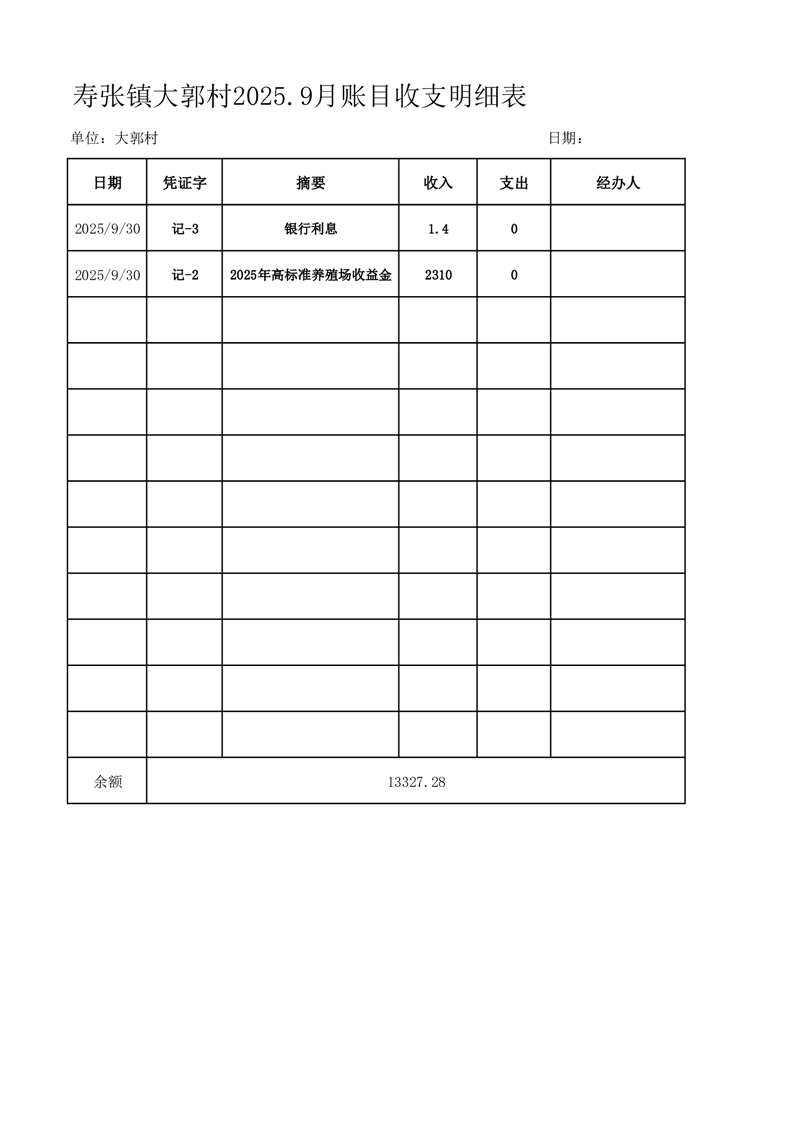 寿张镇大郭村2025.9月账目收支明细表