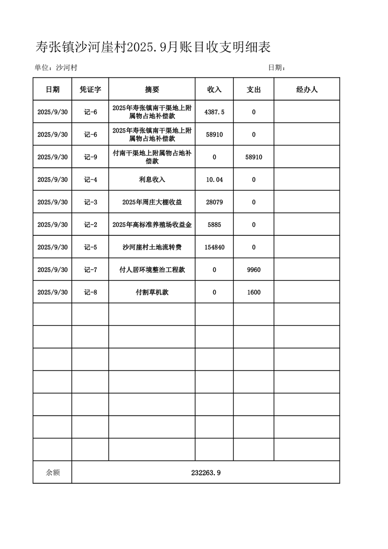 寿张镇沙河崖村2025.9月账目收支明细表