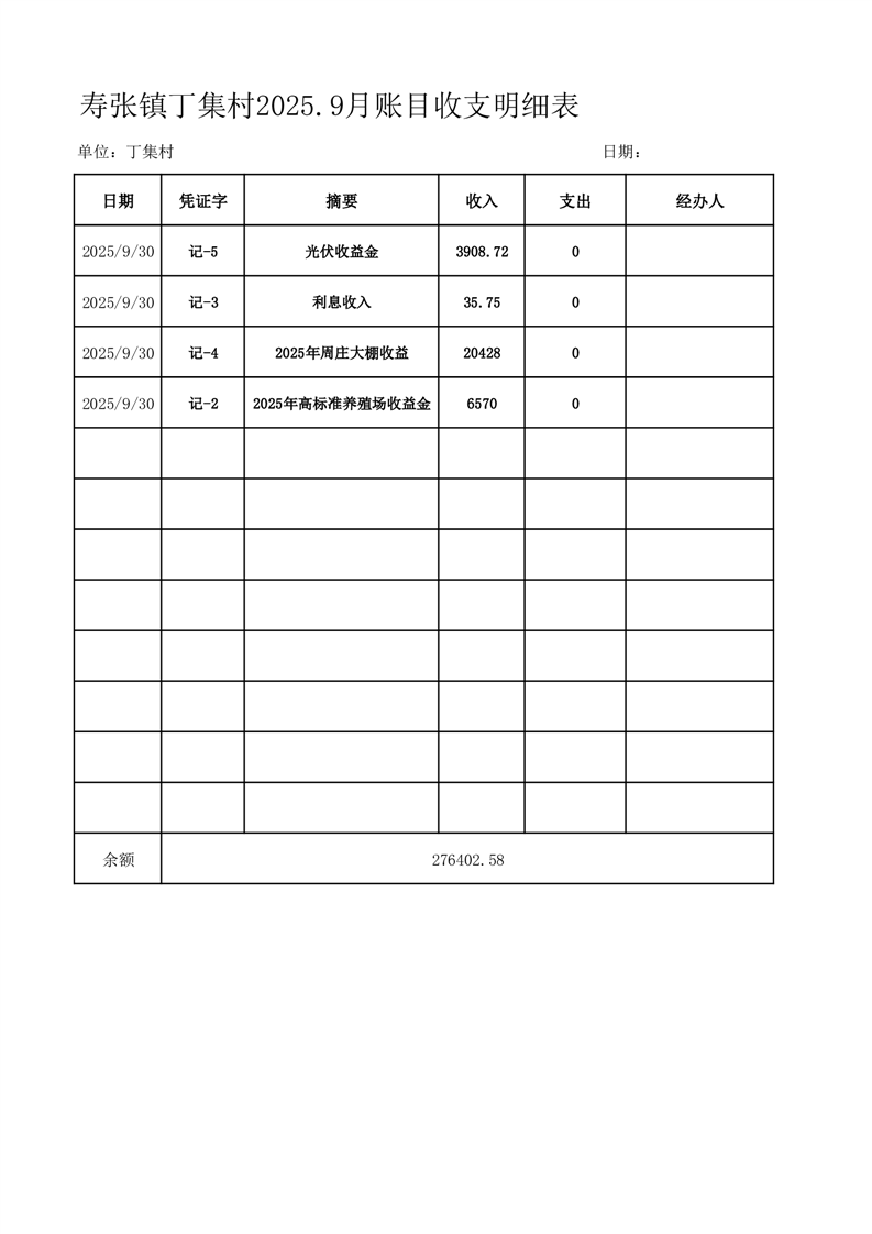 寿张镇丁集村2025.9月账目收支明细表
