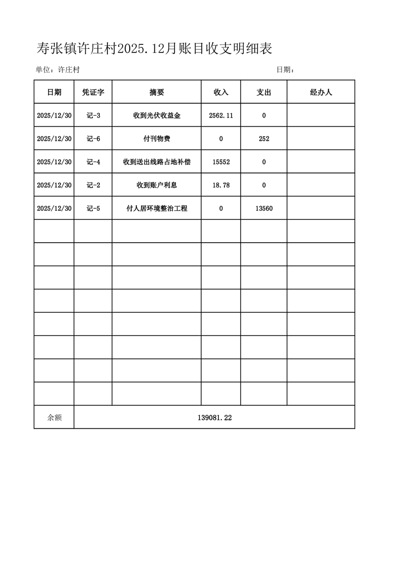 寿张镇许庄村2025.12月账目收支明细表