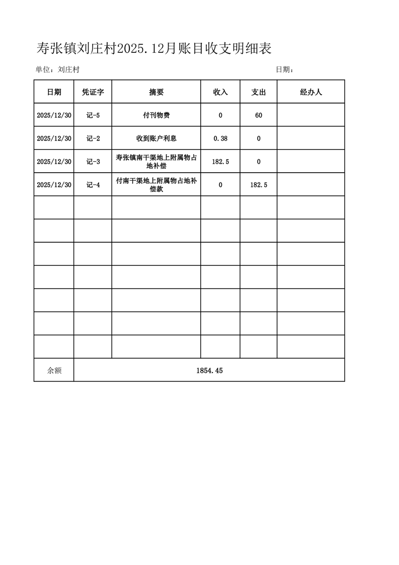 寿张镇刘庄村2025.12月账目收支明细表
