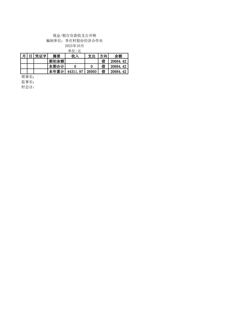 2025年10月份定水镇李庄村账目收支情况一览表