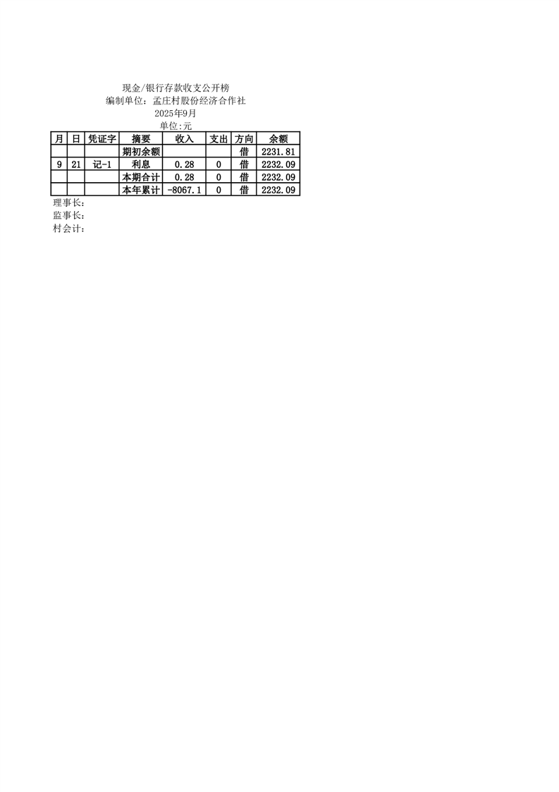2025年9月份定水镇孟庄村账目收支情况一览表