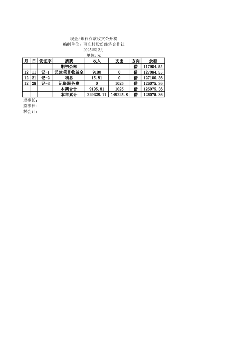 2025年12月份定水镇蒲庄村账目收支情况一览表