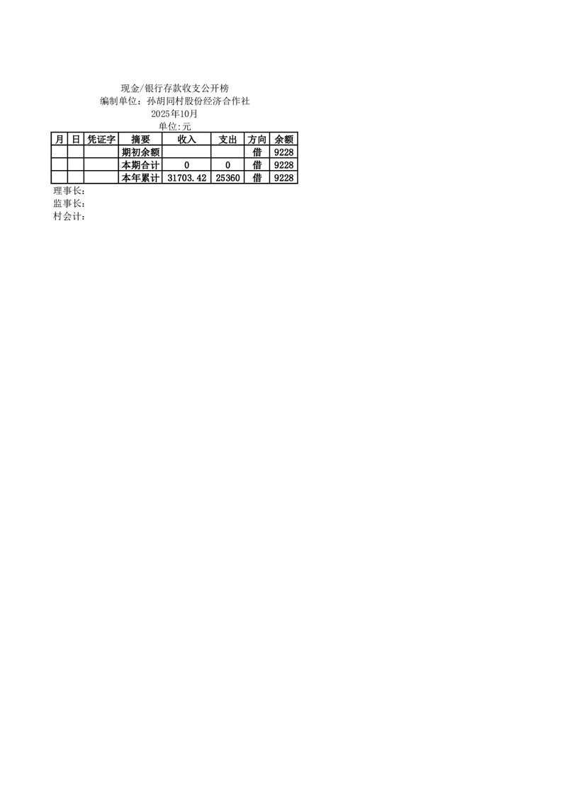 2025年10月份定水镇孙胡同村账目收支情况一览表