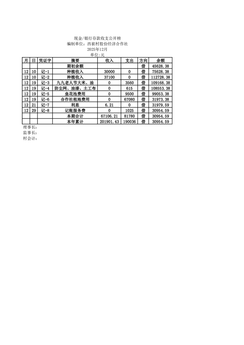 2025年12月份定水镇西崔村账目收支情况一览表