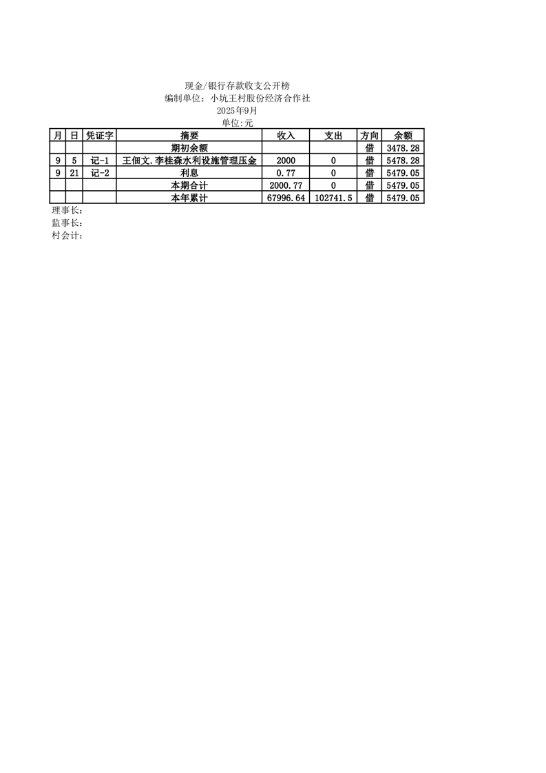 2025年9月份定水镇小坑王村账目收支情况一览表 定