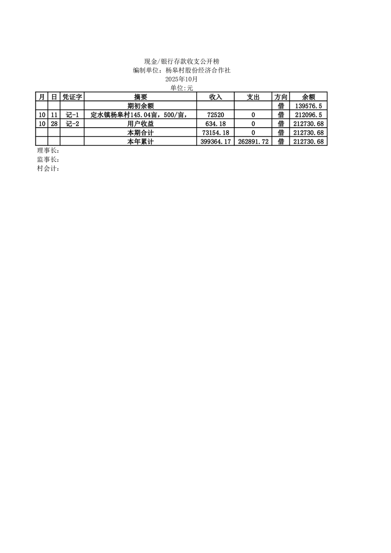 2025年10月份定水镇杨皋村账目收支情况一览表