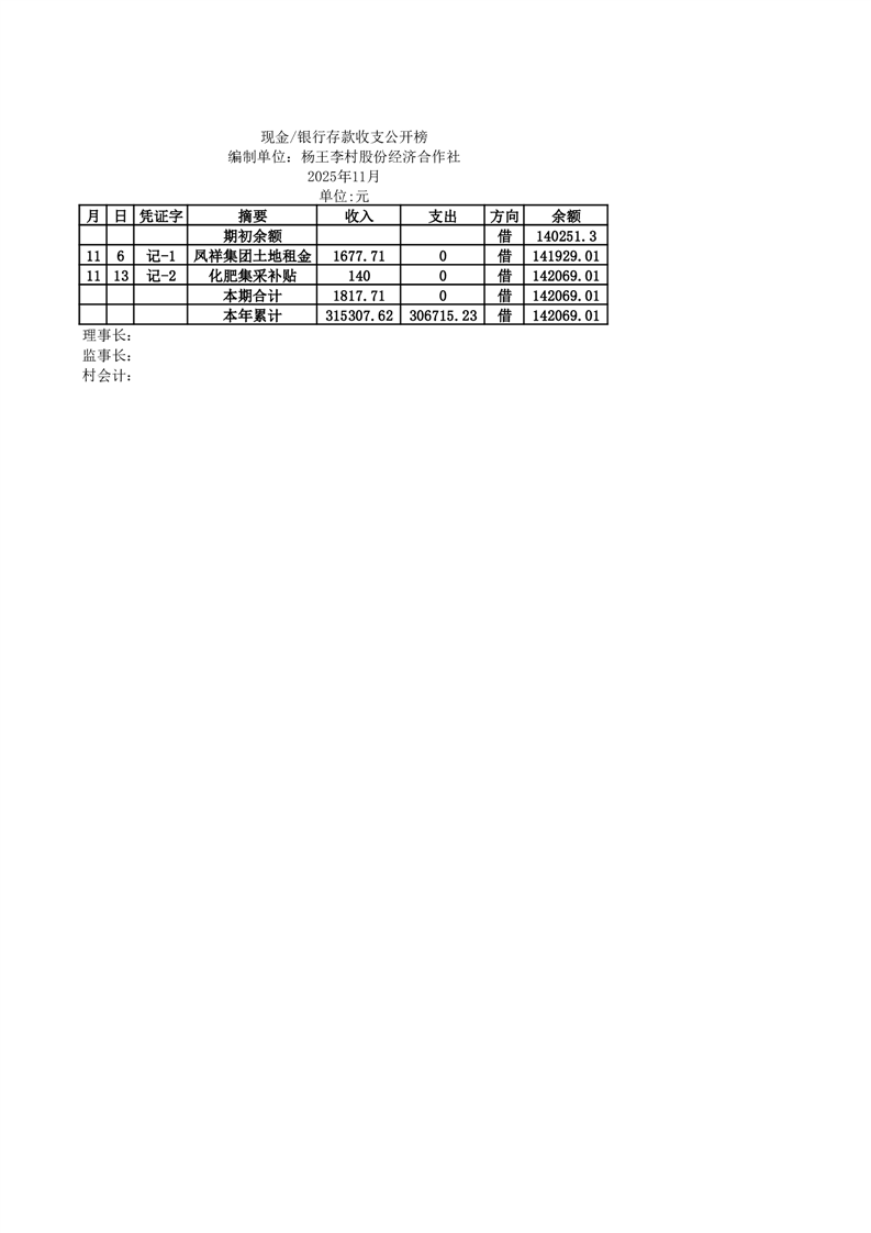 2025年11月份定水镇杨王李村账目收支情况一览表