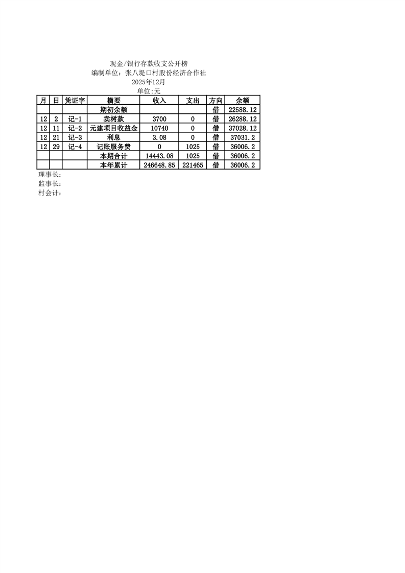 2025年12月份定水镇张八堤口村账目收支情况一览