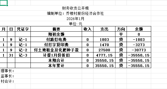 阿城镇乔楼村2026年1月份账目收支明细表