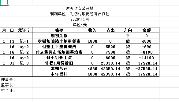阿城镇毛坊村2026年1月份账目收支明细表