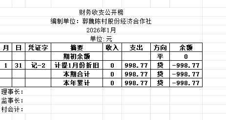 阿城镇郭魏陈村2026年1月份账目收支明细表