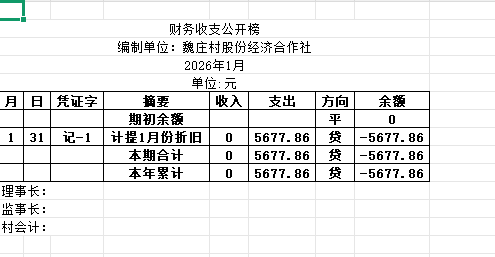 阿城镇魏庄村2026年1月份账目收支明细表