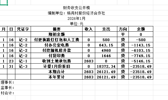 阿城镇杨尧村2026年1月份账目收支明细表