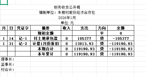 阿城镇朱楼村2026年1月份账目收支明细表