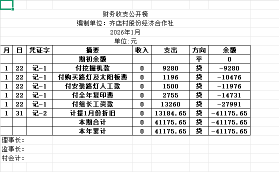 阿城镇齐店村2026年1月份账目收支明细表
