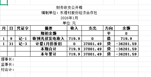 阿城镇东堤村2026年1月份账目收支明细表